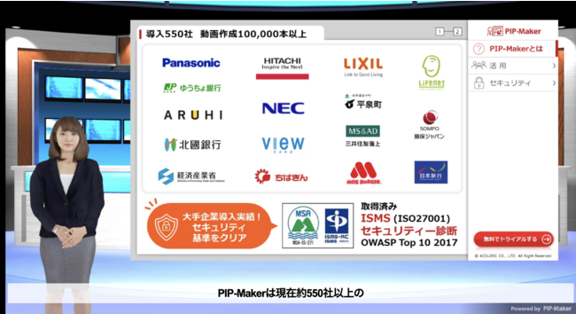 『PIP-Maker』は、パワーポイントから最短5分でアバター・音声付きeラーニング動画を制作でき、習熟度アップ、作業時間の短縮、コスト削減が簡単に実現可能な月額クラウドサービスです。