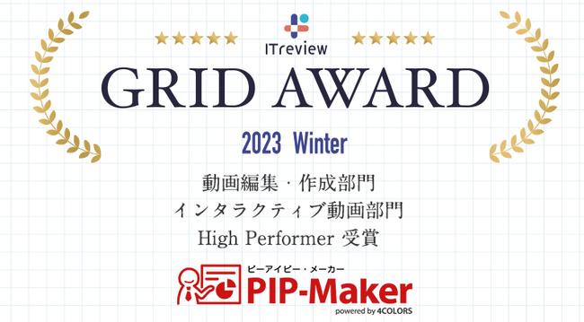 株式会社 4COLORS(本社:神奈川県横浜市、代表取締役 加山 緑郎、以下 4COLORS)が提供する大企業の自律的なDXを推進するアバター動画作成サービス『PIP-Maker』(ピーアイピーメーカ ー)は、アイティクラウド株式会社が運営するIT製品レビューサイト「ITreview」の「動画編集・作成部門」と「インタラクティブ動画部門」の2部門において、お客様満足度が高い製品に贈られる「High Performer」を受賞いたしました。「動画編集・作成部門」では、通算8回目の受賞となります。