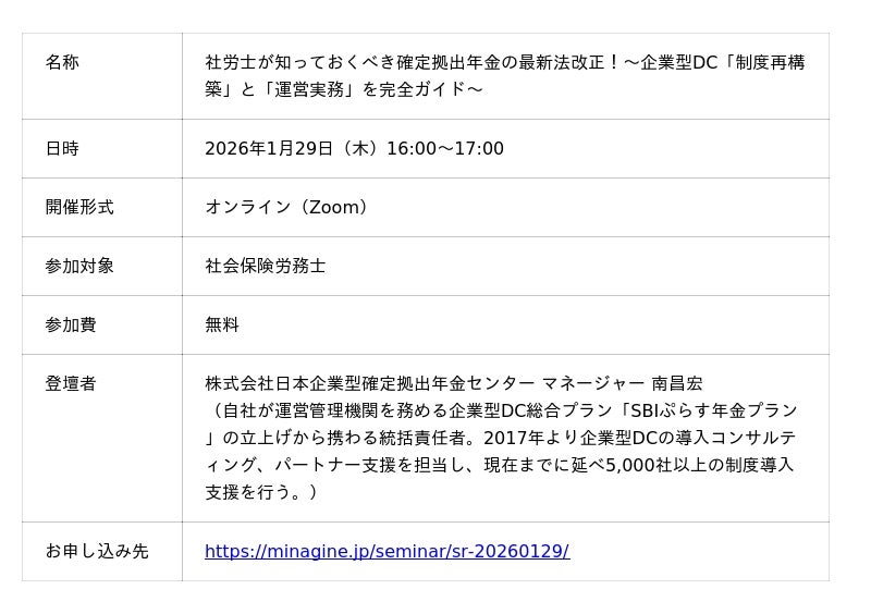 社会保険労務士法人とうかいのグループ企業であり、企業型確定拠出年金(企業型DC)の導入支援で国内最大級の実績を持つ株式会社日本企業型確定拠出年金センター(愛知県名古屋市、代表取締役:久野勝也)は、株式会社kubellパートナー(東京都港区、代表取締役社長:岡田亮一)と共催で、社労士事務所の先生方を対象とした無料オンラインセミナー「社労士が知っておくべき確定拠出年金の最新法改正!~企業型DC「制度再構築」と「運営実務」を完全ガイド~」を2026年1月29日(木)に開催いたします。
