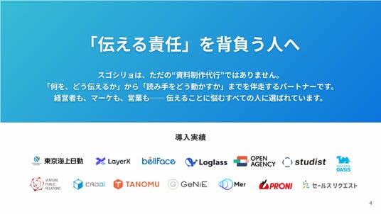 スゴシリョは、企業の資料制作を上流の企画・設計からデザインまでワンストップで支援することで、「読み手を動かす」資料を制作・提供しています。