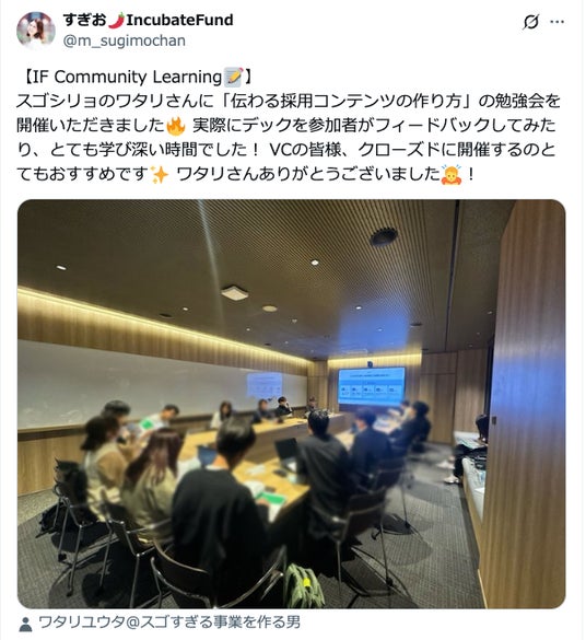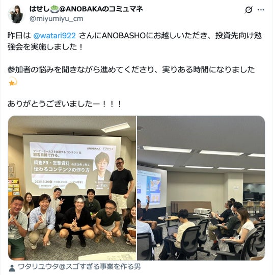 IncubateFund様(2025年5月開催)、ANOBAKA様(2025年10月開催)での勉強会の様子。