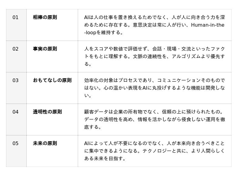 株式会社comeru 代表取締役CTO 石月 裕昭AIの進化によって多くの業務が効率化される一方で、人と人のあいだにある感情や関係性の価値は、これまで以上に重要になると私たちは考えています。comeruではAIを、人の仕事を置き換えるものではなく、人が人らしくあるための「拡張機能」として捉えています。今回制定したAI Principlesは、AI時代においても人の感情や関係性を大切にしながらテクノロジーを活用していくための指針です。