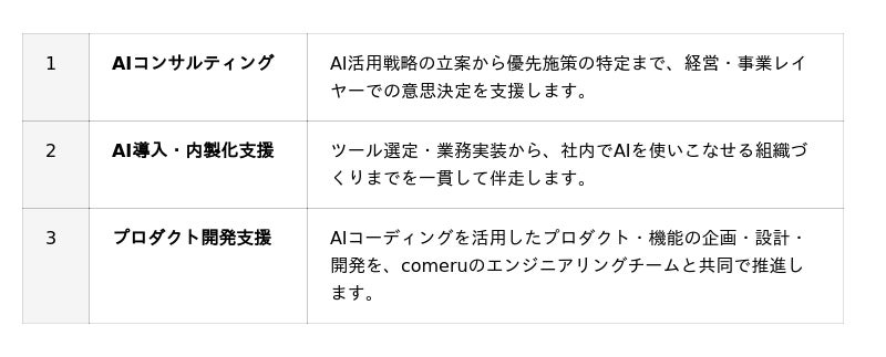 comeruは、AI活用支援事業を通じて蓄積される現場知見をもとに、支援領域・対応業種を順次拡大していきます。コンサルティングから内製化支援、プロダクト開発までを一気通貫で提供できる体制を整え、企業のAI活用における長期的なパートナーとなることを目指します。
