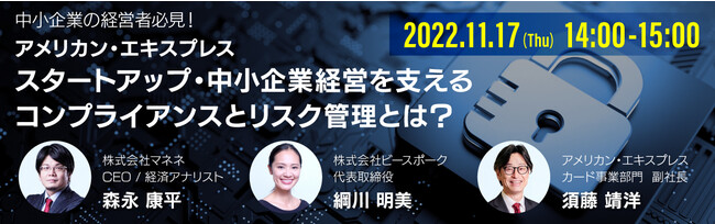 アメリカン・エキスプレス・インターナショナル, Inc.(本社:東京都港区、日本社長:吉本浩之、以下、アメリカン・エキスプレス)は2022年11月17日(木)14時より、起業家及び中小企業経営者に向けたセミナー「スタートアップ・中小企業経営を支えるコンプライアンスとリスク管理とは?」をオンラインで開催します。
