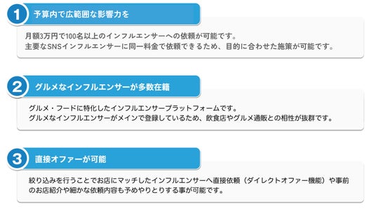 飲食店と、グルメに特化したインフルエンサーをマッチングし、相互で応援・助け合いができる仕組みを提供しています。月額3万円~の定額制で依頼し放題のため、広告予算に限りがある個人店から複数店舗を展開する企業まで、幅広くご活用いただけるサービスです。