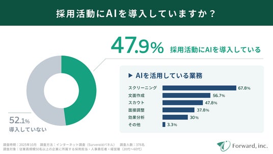 採用業務へのAI導入率は47.9%。スカウトやスクリーニングなどでのAI活用が進み、採用AIは実務フェーズへ。