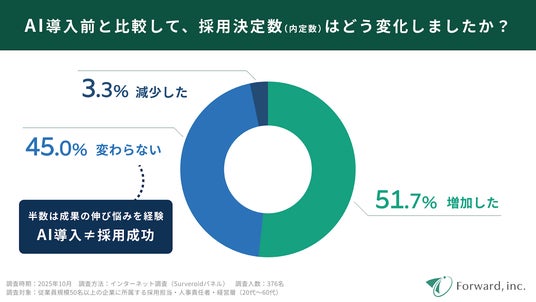 AI導入企業のうち、「採用決定数が増えた」と回答したのは51%。