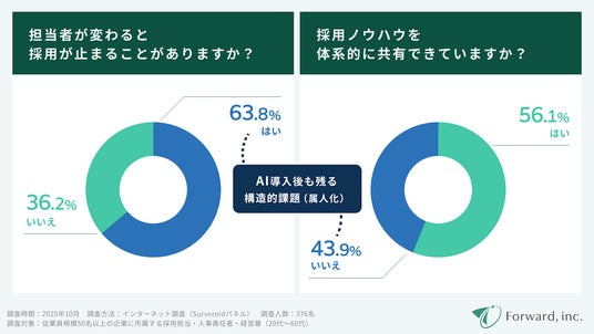 採用の属人化・共有不足が成果化を阻害。「担当者が変わると採用が止まる」企業は63.8%、「採用ノウハウを共有できている」企業は56.1%にとどまる。