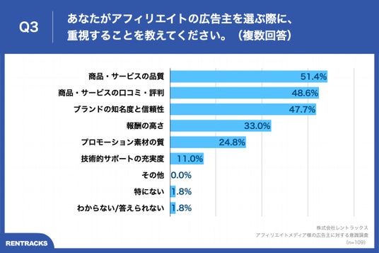 「Q3.あなたがアフィリエイトの広告主を選ぶ際に、重視することを教えてください。(複数回答)」(n=109)と質問したところ、