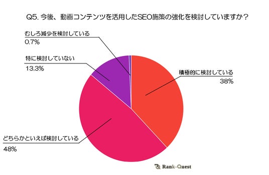 最も多かった回答は「どちらかといえば検討している」(48%)で、多くの企業が動画コンテンツを活用したSEO施策の強化を視野に入れていることがわかります。「積極的に検討している」(38%)も比較的多く、企業が今後の動画活用に対して前向きな姿勢を示していることが示唆されます。