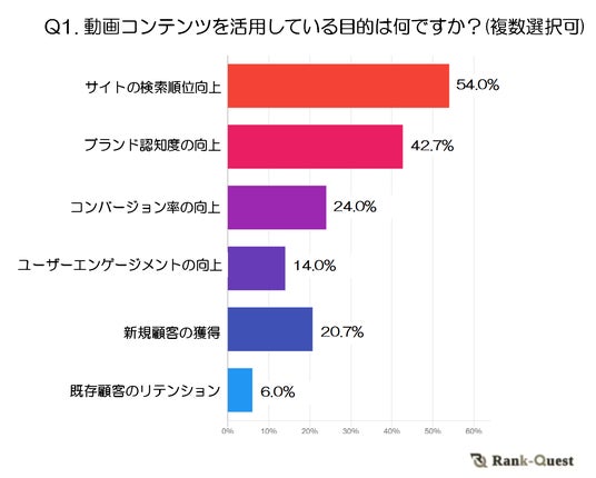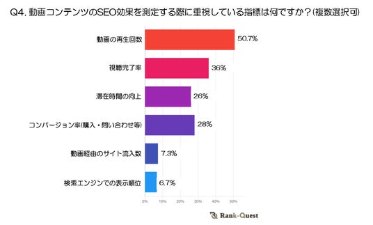 https://rank-quest.jp/column/column/seo-consulting/ )はこのたび、動画コンテンツ活用者150名を対象に、SEO対策としての動画の有効性について調査を行いました。本調査では、検索順位やブランド認知度向上、コンバージョン率といった具体的な効果に加え、視聴完了率や滞在時間の向上など、動画のSEO指標に関する意識を探ります。さらに、今後の動画コンテンツ強化に関する企業の姿勢についても分析しています。