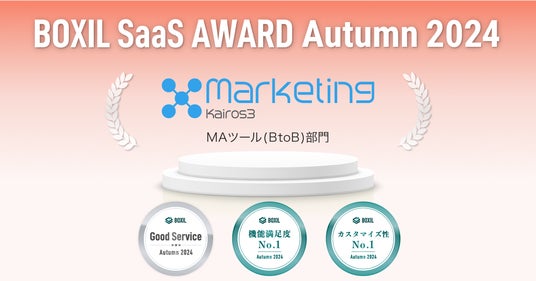 カイロスマーケティング株式会社売上アップを仕組みで実現するCRM「Kairos3(カイロススリー)」を開発・提供するカイロスマーケティング株式会社(本社:東京都渋谷区、代表取締役:佐宗 大介、以下「当社」)は、「Kairos3」のツールの1つであるマーケティングオートメーションツール「Kairos3 Marketing」が、「BOXIL SaaS AWARD Autumn 2024」のMAツール(BtoB)部門にて「Good Service」「機能満足度No.1」「カスタマイズ性No.1」を受賞したことをお知らせします。