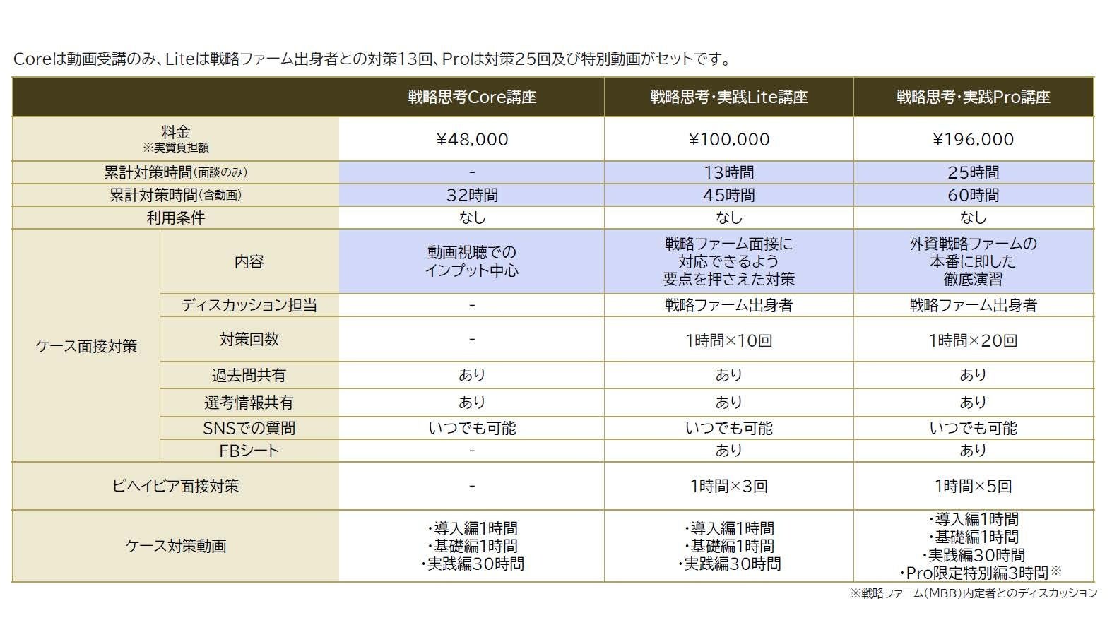 ~戦略コンサル出身講師陣によるケース・ビヘイビア面接指導を軸に、Pro、Lite、Coreの3つの講座を展開~