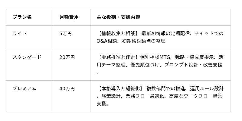 今回のローンチでは、企業のAI活用フェーズに合わせ、役割を明確に分けた3つのプランを展開します。 チャットUI上での活用に留まりがちな状態から、業務フローへの組み込み、組織全体で再現可能な運用へと進めるため、段階に応じた支援を提供します。