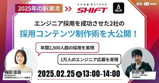 HRブランド戦略・HR戦略コンサルティングを手掛けるオールイン株式会社(本社:東京都渋谷区、代表取締役 前田優一)は、株式会社 SHIFTと共催で、2025年2月25日にオンラインセミナーを開催いたします。