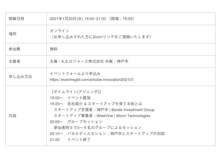 スタートアップ、ベンチャー企業、大手企業の新規事業支援や新規サービス開発支援のスタートアップスタジオ事業を行うK.S.ロジャース株式会社(本社:兵庫県神戸市、代表取締役社長CEO 民輪 一博、以下「K.S.ロジャース」)は、2021年1月20日(水) 午後7時より神戸市と共催で「KOBE INNOVATION ECOSYSTEM」を開催します。