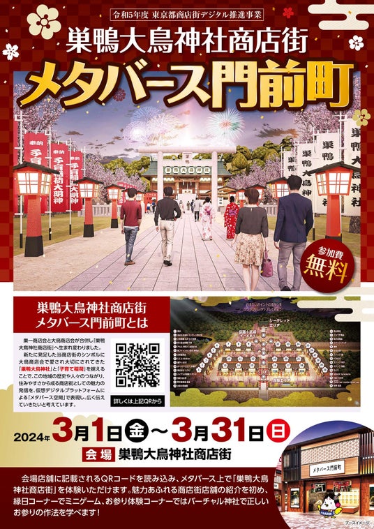 開催中のメタバース空間へは「巣鴨大鳥神社商店」内の店舗にある案内か下記に掲載されているQRコードよりアクセスください。