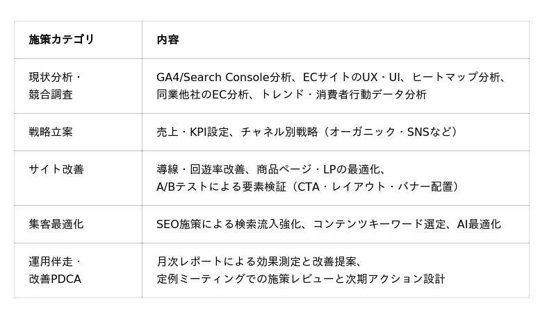 本サービスは、ECサイト運用で手薄になりがちだったデジタルマーケティング領域、特にSEOと、最新の生成AIへの最適化を強みとしています。お客様のEC事業が長期的に成長し、競合優位性を確保できるよう貢献します。