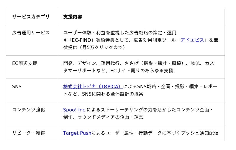 「EC-FIND」は、EC事業の成長に向けた入り口として、ルビー・グループが提供する他の広範なECサービスと連携し、お客様の事業拡大を多角的に支援します。