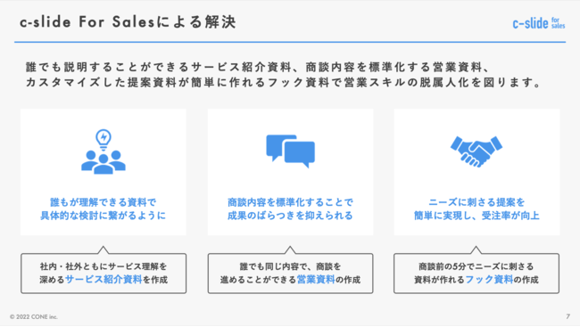 株式会社CONE(本社:大阪府大阪市、代表取締役:佐藤立樹)が運営する資料作成代行サービス「c-slide」は、10月12日より、資料の改善を通して営業組織の標準化を支援するサービス「c-slide for sales」(https://cone-c-slide.com/sales/)を新たに提供開始いたしました。