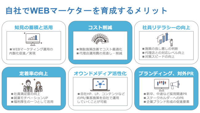 持続的に利益を出していくためには、外部に一任するだけではなく、会社の中にWebマーケティングをわかる人材を配置し、評価し、育てる仕組みを根付かせ、マネジメントしていくことが大切だと考えています。