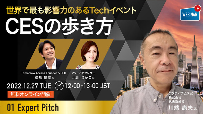 日本とシリコンバレーを繫ぐコンサルティング会社 Tomorrow Access LLC(本社:米国カリフォルニア、Founder & CEO:傍島 健友)は、10万人以上の参加者になると予想される“世界で最も影響力のあるTechイベント「CESの歩き方」“をテーマにした無料オンラインウェビナー「01 Expert Pitch #18」を開催します。