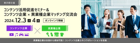 特定非営利活動法人映像産業振興機構(略称:VIPO[ヴィーポ]、理事長:松谷孝征、東京都中央区)は、東京都の令和6年度予算による「コンテンツ活用促進事業」の実施運営等を受託し、2024年12月3日(火)・4日(水)に「コンテンツ企業 × 異業種企業 マッチング交流会」を