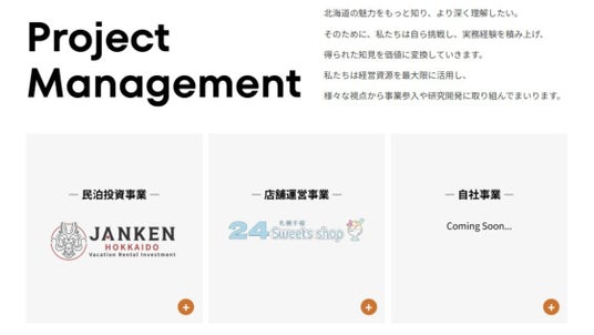 民泊投資事業「JANKEN」、無人スイーツ販売店「24スイーツショップ」、クリエイティブ事業の詳細情報をそれぞれ独立したセクションに分類し、事業展開を体系的に理解できるよう視覚的に明瞭な形で提示することで、ステークホルダーへの透明性を確保しました。
