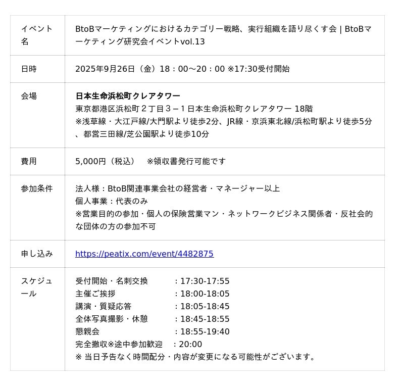 BtoBマーケティングにおけるカテゴリー戦略、実行組織を語り尽くす会』を、2025年9月26日(金)、日本生命浜松町クレアタワー(東京都港区浜松町)にて開催いたします。本イベントでは「