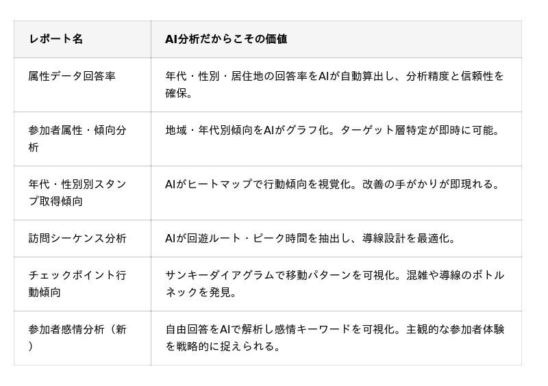 さらに、既存の5種類のAI分析レポート(属性回答率・参加者属性傾向・年代性別スタンプ取得傾向・訪問シーケンス・チェックポイント行動傾向)と連携することで、