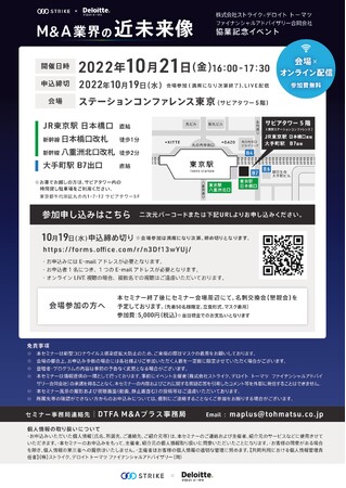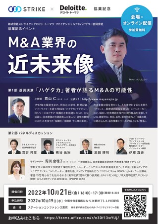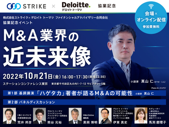株式会社ストライクは、9月よりデロイト トーマツ ファイナンシャルアドバイザリー合同会社(DTFA)との協業を開始しました。この度、両社の協業を記念したセミナー「M&A業界の近未来像」を10月21日(金)に開催いたします。