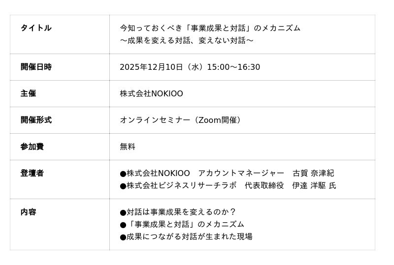 今知っておくべき「事業成果と対話」のメカニズム ~成果を変える対話、変えない対話~と題したセミナーを開催します。ぜひこの機会にご参加ください。