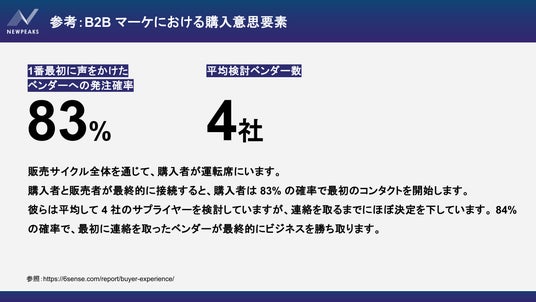 昨今のB2Bマーケティングにおいて、サービス導入をする際に、平均4社との商談を行いますが、83%の確率で、最初に声をかけたベンダーへの発注をするというデータが出ております。