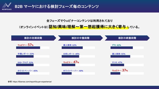 また、顧客の購買検討フェーズでは、すべてのフェーズにおいて、オンラインイベント(特にウェビナーコンテンツ)が大きく寄与しており、認知/興味/理解から第一想起の獲得に寄与しております。
