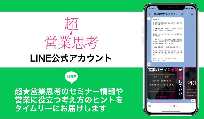 AthReebo株式会社(本社:東京都世田谷区、代表取締役:金沢景敏)は、この度、当社代表取締役・金沢景敏の「超★営業思考」をもとに営業パーソンへ圧倒的な結果が出る思考法を伝えるLINE公式アカウント『超★営業思考|AthReebo』を開始したことを発表いたします。ここでしか観られない無料動画やセミナー情報をはじめ、具体的な行動の背景にある、圧倒的な結果を出すための「思考法」を体感いただくオリジナルコンテンツをご用意。LINE公式アカウント開設を記念して、アンケート回答&ビジネスパーソンにLINE紹介で6本の秘密動画プレゼントを実施中です。