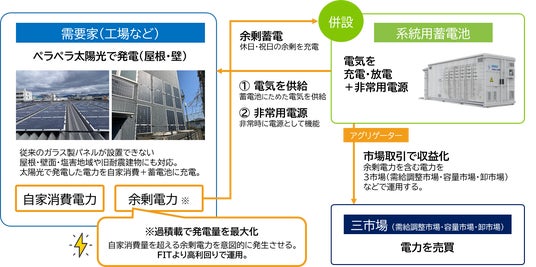 今回提供を開始するハイブリッド電力経営モデルは、法人需要家の建物に、超薄型・超軽量太陽光パネル「ペラペラ太陽光」を設置し、自家消費率を高めるために過積載設置を行うことで余剰電力を創出。その余剰電力を併設した「系統用蓄電池」に蓄え、FIT(固定価格買取制度)に依存せず、「三市場」(需給調整市場・容量市場・卸電力市場)で運用する仕組みです。
