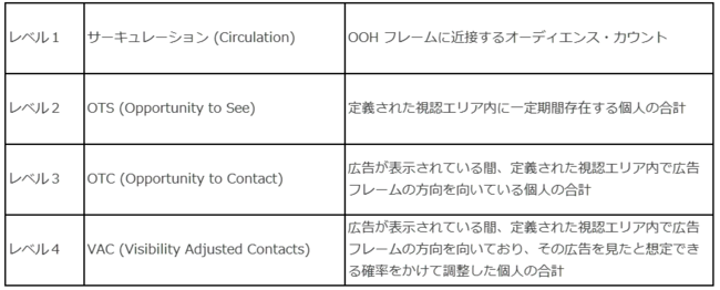 交通広告/屋外広告のメディアカレンシー(媒体取引標準価値指標)は、世界で唯一のグローバルOOH業界団体WOO(World Out Of Home Organization) が2022年5月に発表した「OOHオーディエンス測定の新しいグローバルガイドライン」(日本語版は10月にデジタルサイネージコンソーシアムより発行)にて、OOHオーディエンス・メジャメントの標準化を推進するために、4レベルの指標を定義しています。