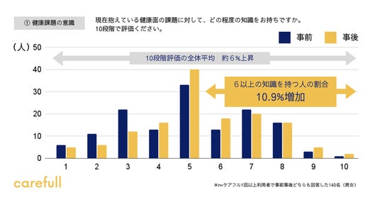 63.9%の女性社員が健康面の課題を感じていることが事前調査で明らかになりましたが、実証期間後には、その当事者のヘルスリテラシースコアが全体で約6%、6以上の知識を持つ人の割合は10.9%向上しました。これはcarefull(ケアフル)の利用を通して、適切な情報やアドバイスにアクセスできるようになったからだと考えられます。また、女性社員だけでなく、男性社員のリテラシーも大幅に改善しました(約12%改善)。さらに、職場全体のリテラシーが向上した結果、女性特有の健康課題によるキャリアへの影響について、上司に相談する男性社員が36.8%増加しました。