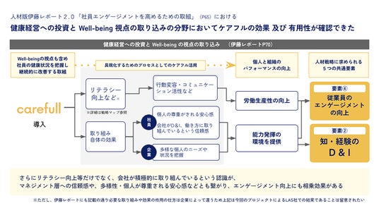 人的資本経営を変革・実現させていくためにどう具体化し実践に移していくかの有用なポイントとして人材版伊藤レポート2.0の中で提言された「3つの視点・5つの共通要素」の枠組みをもとに、くらしアプライアンス社へcarefull(ケアフル)を実証導入した結果を分析すると、「知・経験のD&I」と「従業員エンゲージメント」に好影響があると言えることが分かりました。
