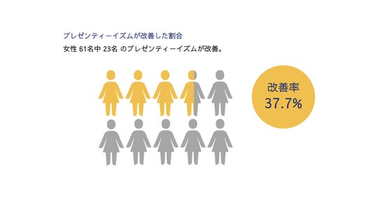 プレゼンティーイズムは、出勤しているにも関わらず心身の健康上の問題が作用して、パフォーマンスが上がらない状態で、労働生産性が低下しているとも言えます。女性の健康問題が顕在化しているときはプレゼンティーイズムが生じています。carefull(ケアフル)を利用した女性社員のうち37.7%が、プレゼンティーイズムが改善しました。