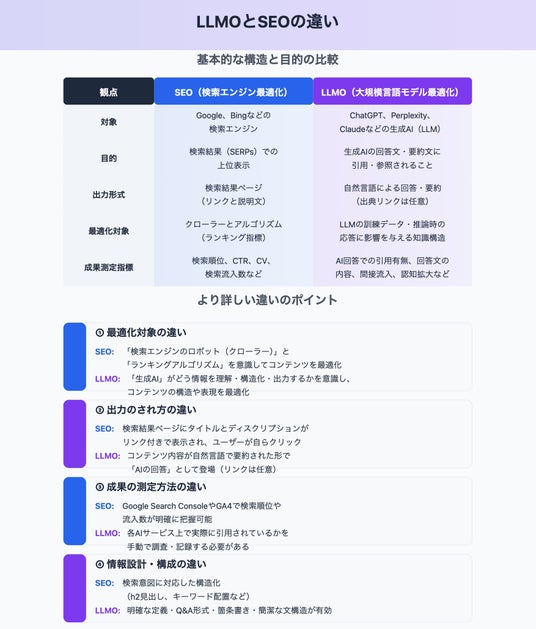 SEOとLLMOは対象と最適化手法が根本的に異なります。SEOはGoogle・Bingなどの検索エンジンでの上位表示を目指し、クローラーとランキングアルゴリズムを意識したコンテンツ最適化を行います。一方、LLMOはChatGPT・Perplexityなどの生成AIの回答に引用・参照されることを目的とし、AIがどう情報を理解・構造化するかを考慮した最適化を行います。