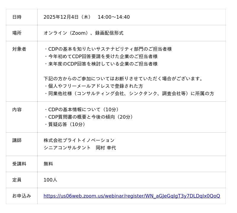 株式会社ブライトイノベーション(本社:東京都中央区、代表取締役社長:荻巣 和紀、以下「当社」)は、CDP質問書へ初めて回答する企業のサステナビリティ部門や経営企画部門のご担当者様向けに、CDPの基礎理解から最新動向をコンサルタントが解説する、無料ウェビナーを開催します。