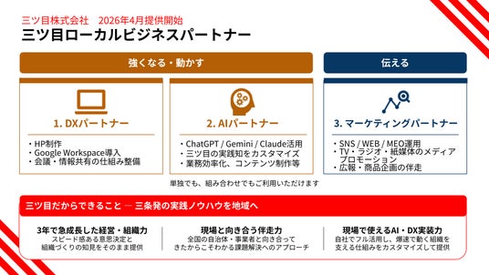 三ツ目株式会社(本社:新潟県三条市、代表取締役:澤 正史、以下「三ツ目」)は、主に新潟県内の事業者を対象に、経営・組織課題の解決からプロモーション支援まで包括的に伴走するサービス「地域の『らしさ』を、伴走力とデジタルで加速させる。三ツ目ローカルビジネスパートナー」を2026年4月より本格始動いたします。三ツ目は創業以来、ふるさと納税支援事業を中心に、地域の魅力を引き出すマーケティング支援を行ってきました。全国の自治体・事業者と向き合い続ける中で積み上げてきたのは、単なる支援ノウハウだけではありません。リモートワークやAI活用を組み合わせた組織運営、スピード感ある意思決定と業務設計など、三ツ目自身が実践してきた「爆速で動く組織のつくり方」そのものです。