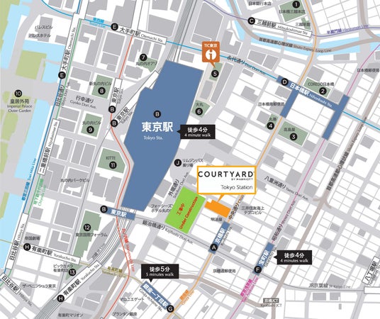 トラストシティカンファレンス・京橋は東京駅徒歩4分、京橋駅徒歩1分とビジネスマンにとって好立地の場所に位置する会議室です。コートヤード・バイ・マリオット東京ステーションの4階にあり、遠方の方にとっても高い利便性を有しております。