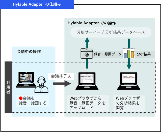 Hylable Adapter にWeb会議やICレコーダー、ビデオカメラなどで録音・録画したデータをブラウザからアップロードするだけで自動的に分析が可能です。