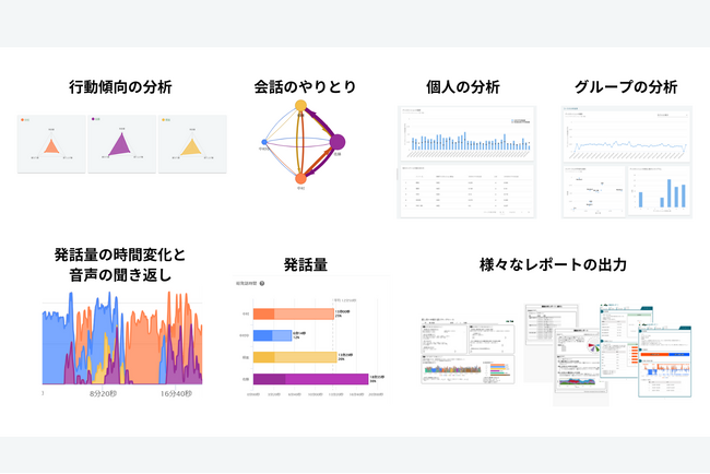 会議参加者の発話量やその変化、やり取りのパターン、割り込みや盛り上げの状態を自動的にグラフで見える化することで、参加者自身の行動と会議のメタ認知を促し、会議を活性化させます。