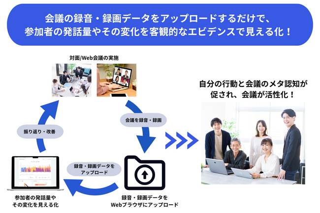会議の録音・録画データをアップロードするだけで参加者の発話量やその変化を見える化。参加者自身の行動と会議のメタ認知を促し、会議を活性化させます。