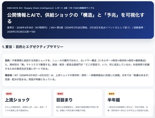データ分析・AI技術を活用して企業課題の解決を支援するNOB DATA株式会社(本社:福岡県福岡市博多区、代表取締役:大城 信晃)は、公開情報とAIを活用して、日本およびグローバルの物流状況を把握・整理する「NOB DATA SCI(Supply Chain Intelligence)レポート(β版)」の提供を開始しました。