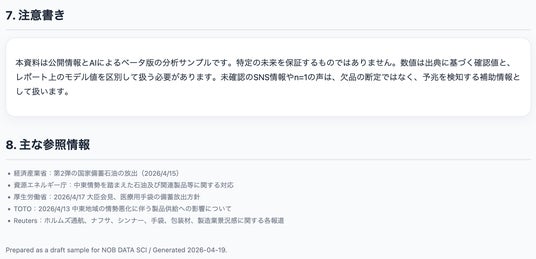 ■「NOB DATA SCI(Supply Chain Intelligence)レポート(β版)」の概要「NOB DATA SCI(Supply Chain Intelligence)レポート(β版)」は、物流に影響を与える複数の公開情報を横断的に収集・整理し、企業の意思決定に必要な観点を短時間で把握できるようにするレポートです。