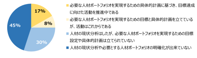 調査した項目の中で「取組みレベルに課題がある3項目」の一つ目は、「人材ポートフォリオの具体的計画と目標達成に向けた活動」であり、全体の75%と4分の3もの企業で「人材ポートフォリオ実現に向けた具体的計画が立てられていない」ことが分かります。